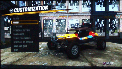 メニュー画面では車やバイクなどの乗り物のカスタマイズが可能。